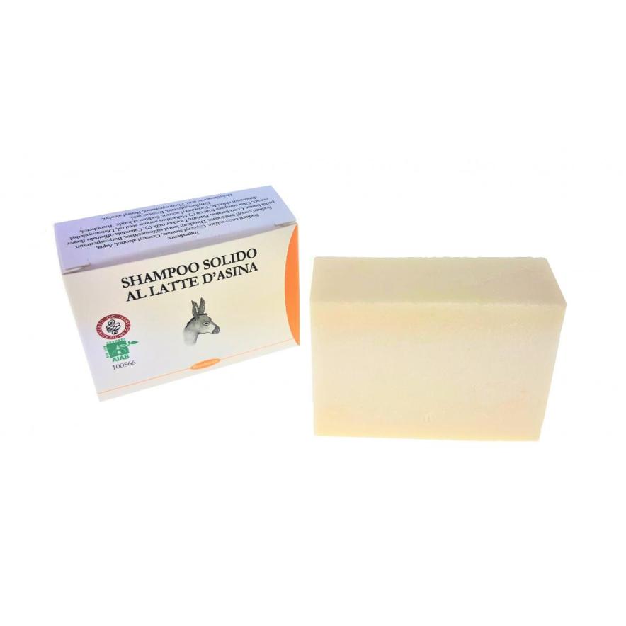 Shampoo solido al Latte d'Asina, deterge delicatamente donando nutrimento e luminosità . E' un trattamento per la bellezza ed il benessere del cuoio capelluto e dei capelli che appaiono morbidi e corposi. Certificaro Aiab, contiene 65 grammi di prodotto nella scatoletta da cm 8 x 6 x 3.